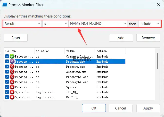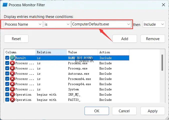 打开ProcessMonitor捕捉ComputerDefaults.exe的运行信息,在Filter工具栏设置Process Name为ComputerDefaults.exe,Result设置为NAME NOT FOUND
