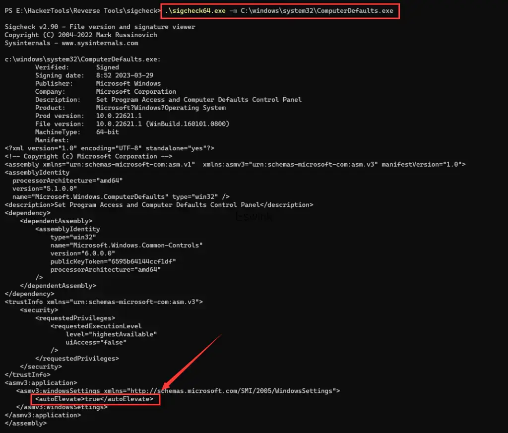 使用sigcheck工具查看可执行程序的相关信息,如下图所示可以看到名为autoElevate的标签,当其被设置为true时,它表示该应用程序在启动时会自动请求和获取管理员权限,前提是当前的用户账户有管理员权限
