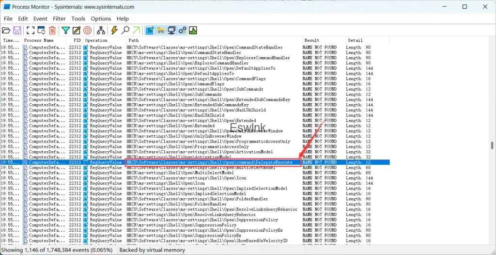 注意此路径HKCU\Software\Classes\ms-settings\Shell\Open\command, 这行的操作是RegQueryKey,表示查询注册表的一个键