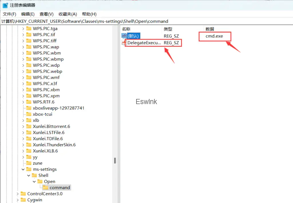 在注册表对应的键中添加个键值为DelegateExecute,并将此目录的默认键值设为cmd.exe