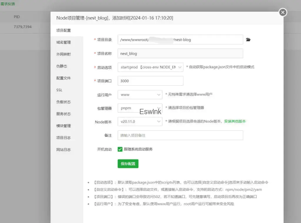 }简单的启动命令就完事,如果需要使用PM2来实现持久化,我推荐是使用宝塔面板来帮助我们操作,或者你自己安装PM2,然后在项目根目录配置一个ecosystem.config.js文件,内容示例: