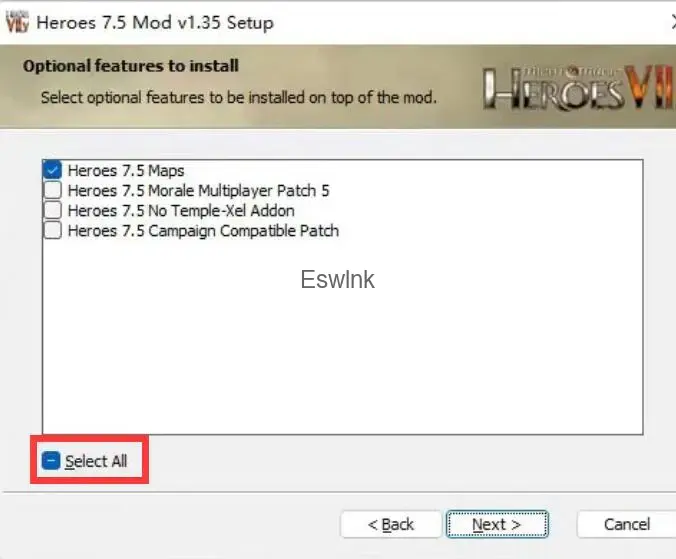 解压Heroes_7.5_Mod_1.35.rar文件,运行解压后的Heroes 7.5 Mod Install.exe进行Mod补丁的安装。在选择部分,请全选并点击Next,直到安装完成。
