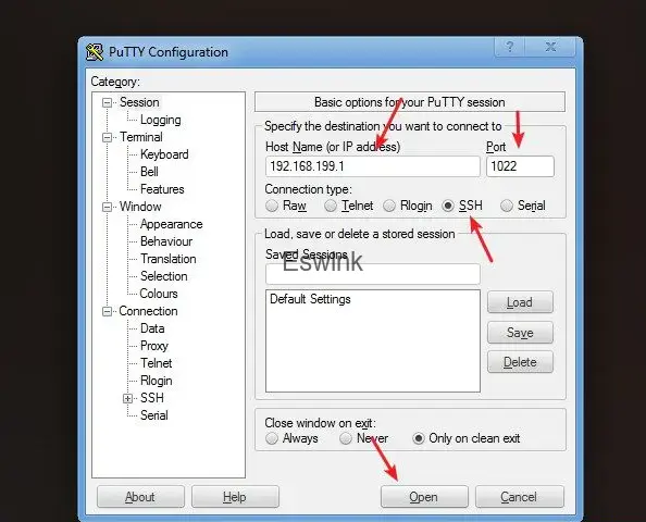 接下来,我们打开 putty 软件,输入 IP 地址:192.168.199.1(根据您登录路由器时使用的 IP 填写相应的地址),端口为 1022,选择 SSH,然后点击“Open”按钮即可连接。