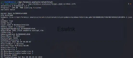 >>>sudo python3 vol.py -f ../Target.vmem windows.info