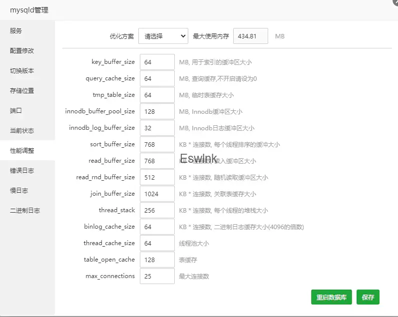 这是我已经优化好的设置,MySQL 最大占用为 434.81MB,而默认情况下接近 1GB。通过这样的设置,可以为 1GB 内存的小型服务器节省数百 MB 的内存!
