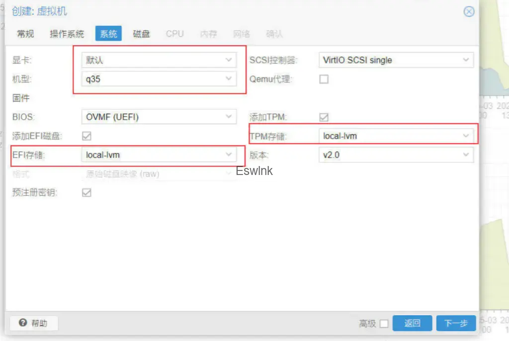 EFI存储和TPM存储直接选择本地存储,local-lvm或者你自己新增的磁盘都可以。