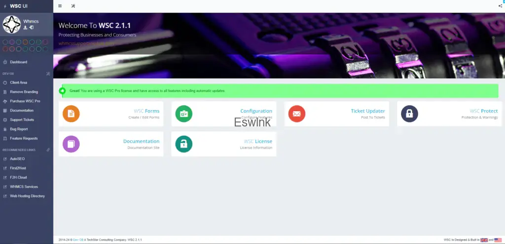 WSC UI 提供了一个易于使用的界面来配置 WSC 的各种优势。可用的功能依赖于许可证。WSC 免费用户只能访问 WSC 的基本功能。通过使用智能编码,我们简化了 WSC 的部署。所有用户都可以将 WSC 上传到 WHMCS,并自动将所需的代码添加到 WHMCS 模板中。