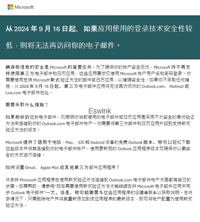 如果你收到这封电子邮件,则表明你当前使用的电子邮件或日历应用是采用不太安全的身份验证方法来连接到你的 Outlook.com 电子邮件帐户。你需要将第三方邮件和日历应用升级到支持新式验证方法的版本。