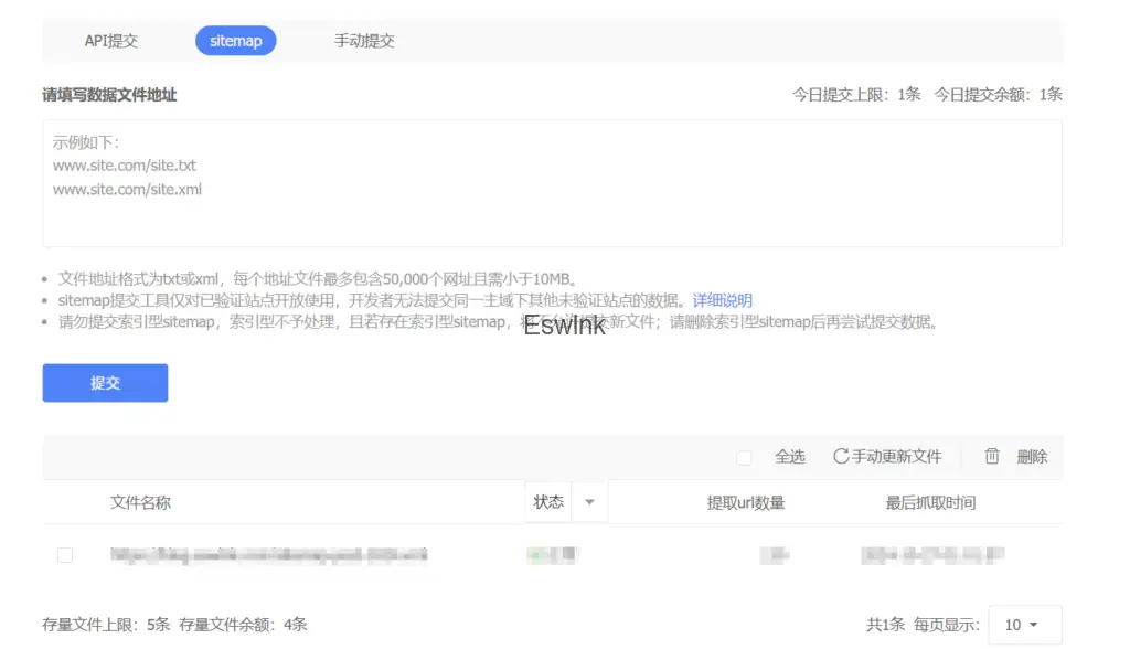 问:普通收录的sitemap入口提示: 存量文件上限:1条 存量文件余额:1条 但是我无法请填写数据文件地址和提交sitemap,希望管理员帮忙处理一下,谢谢