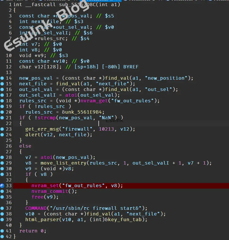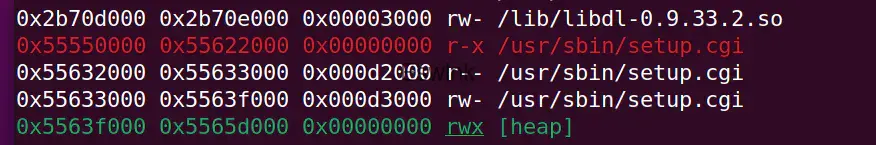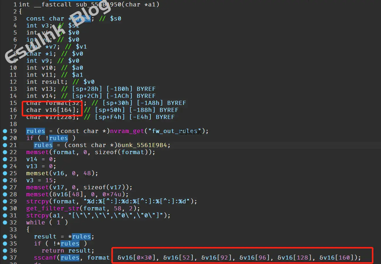 通过对 setup.cgi 的逆向分析,发现 sub_555BA950 函数从 nvram 中获取了环境变量 fw_out_rules 的值。然而,这个值没有进行有效的长度检查,并且在 sscanf 中以不安全的方式进行格式化写入,导致栈溢出漏洞的产生。这个漏洞可以被利用来覆盖栈上的数据,进而执行恶意代码。