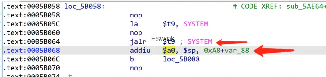 在这里跳到 $t9 也就是 system 之后,会执行一下下面的那条语句(也就是 5B068 处的语句)之后才继续在 system 里面执行