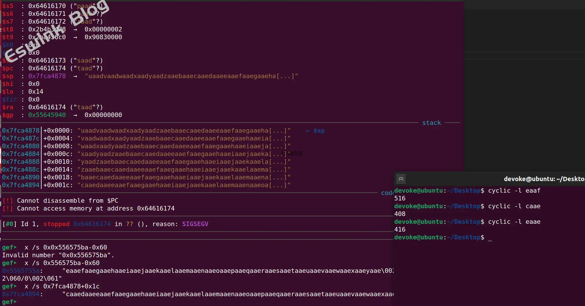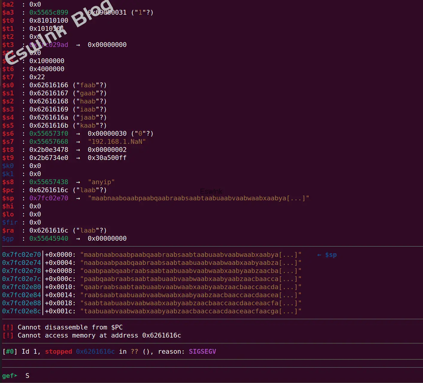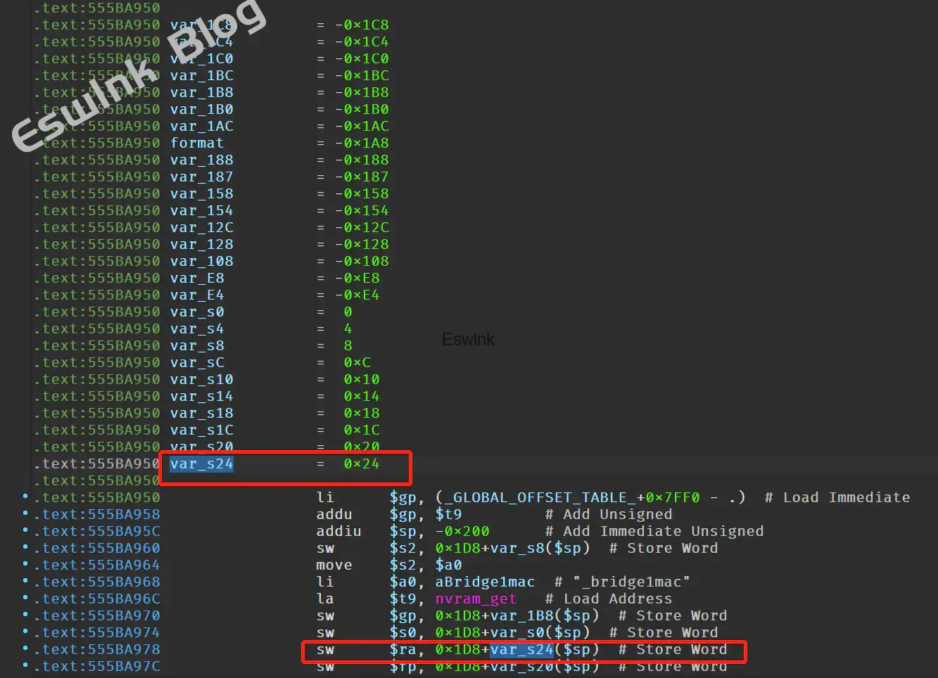 mips调用函数时将返回地址放在 $ra,与x86架构类似,在函数起始处压栈,结束时弹出,通过ja指令跳到返回地址,所以需要溢出到var_s24来劫持控制流。