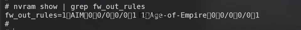 直接访问fw_rules.htm,搞几个规则,使用 nvram show | grep fw_out_rules 可以看到这个变量储存的是Service name还有一些数字啥的。