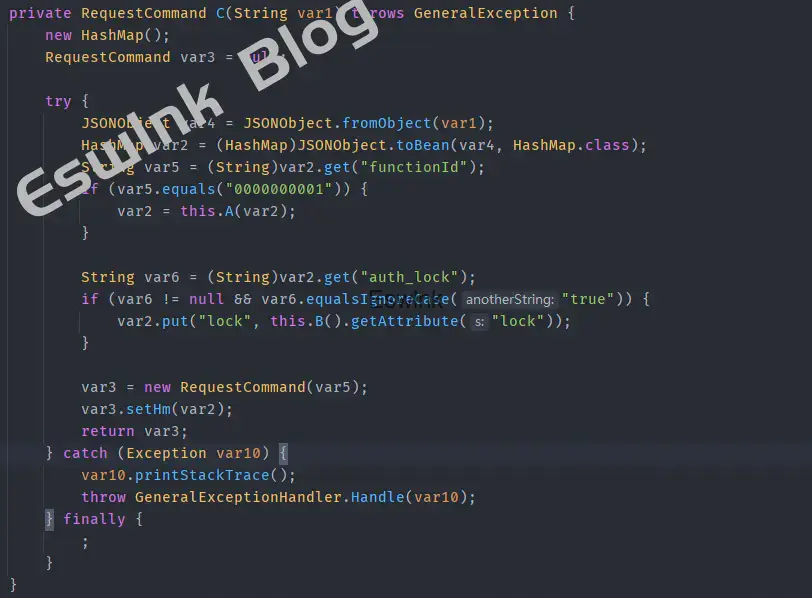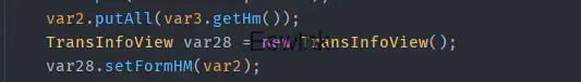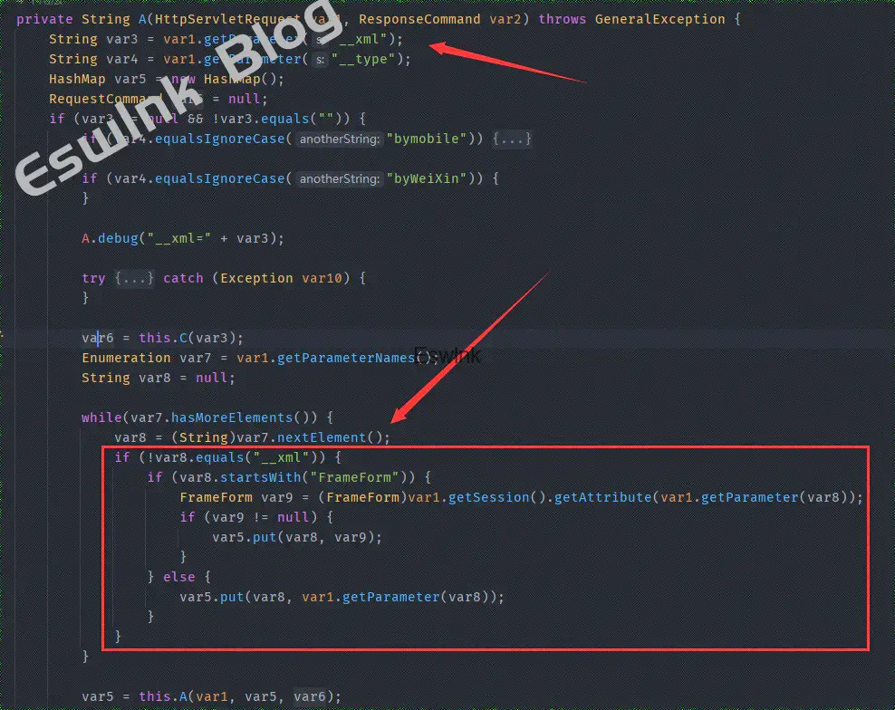 可以看到是获取请求中__XML变量的值,通过C(String var1)方法将Json字符串转为RequestCommand的hashmap存入,同时在A(HttpServletRequest var1, ResponseCommand var2)方法中将请求中其他键值对存入hashmap,之后调用前面AjaxController#A()方法,将两个的hashmap合并,一并赋值给TransInfoView.setFormHM中。