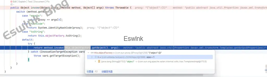 用 JSONObject 代理 ObjectFactoryDelegatingInvocationHandler 中的 objectFactory 属性,返回 teamplatesImpl
