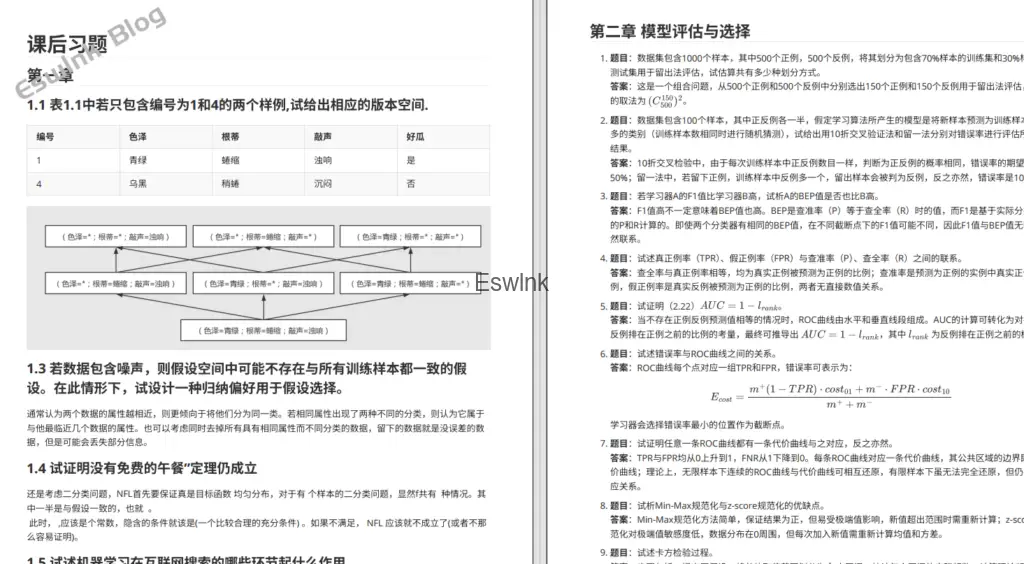 本资料系统整理了机器学习各章节核心内容,涵盖模型评估、线性与非线性模型、神经网络、支持向量机、贝叶斯分类、集成学习、聚类、降维与特征选择等主题。内容形式包括课后习题解析、公式推导、编程实现思路及单选题,适用于课程复习、考研备考及实战应用能力提升,具有较强的系统性与实用性。