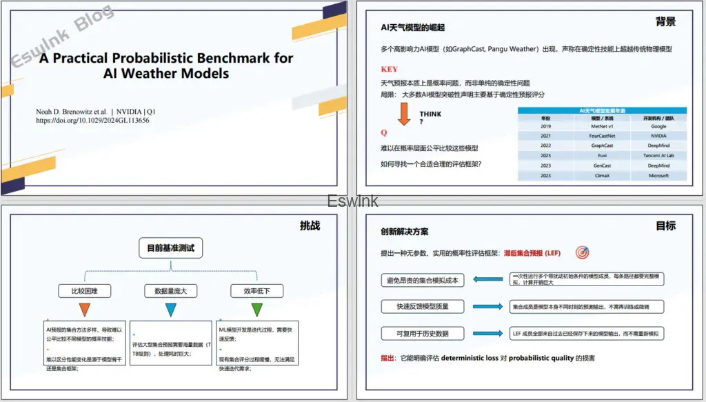 随着AI天气模型(如GraphCast、Pangu-Weather等)在确定性预报上的表现超越传统数值模型,业界急需一种统一且公平的概率性评估框架。当前的评估方式依赖高计算开销的集合模拟,无法满足AI模型快速迭代与开发需求。