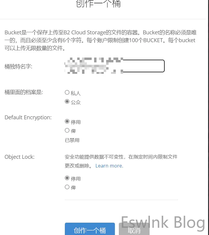 - 登录 b2_buckets 网站创建一个存储桶这里的权限选择公众 (public),并且桶的名称是全局唯一且不能泄露的,因为一旦泄露那么恶意访问者就可以刷光你的额度了。