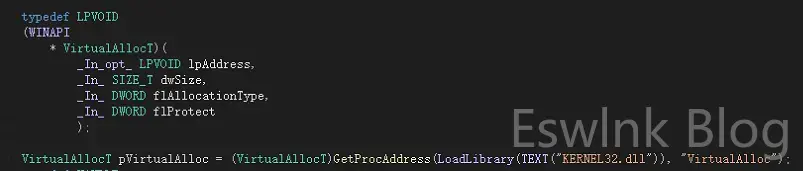 typedef这里做了一个函数指针,其次我将VirtualAlloc声明成 VirtualAllocT ,VirtualAllocT作为一个新的类再进行动态调用kernel32.dll,其它的几个函数也是同理。