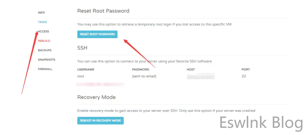 这里我们需要注意!如果你使用你最先配置的密码无法ssh连接服务器,可以通过 Access – RestPassword重置密码!