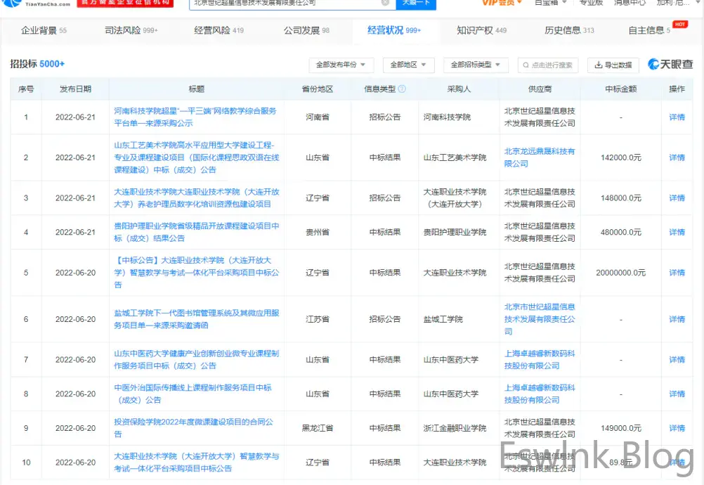 招投标信息显示,该公司曾中标二千多家大学、图书馆、政府机构等项目。其中今年以来该公司已有300条中标信息,服务对象包括河南科技学院、云南中医药大学、浙江金融职业学院、上海财经大学浙江学院、山东旅游职业学院等。