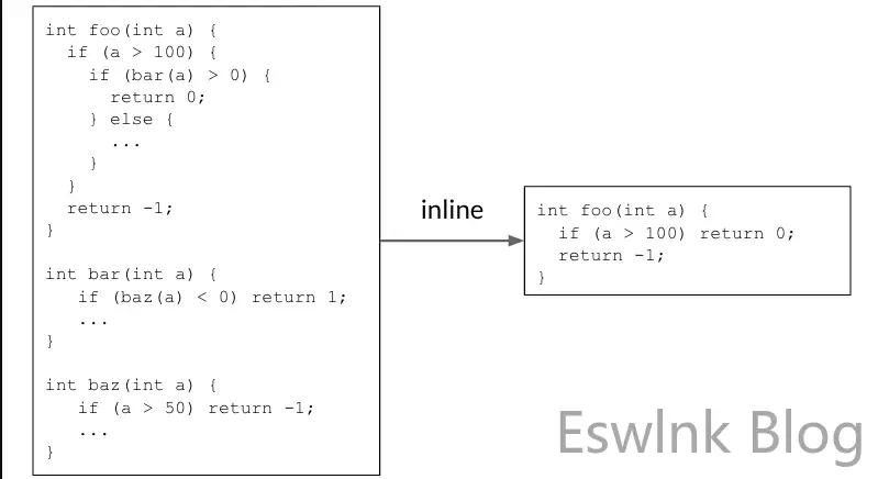 内联通过做出能够删除冗余代码的决策来帮助减少代码大小。在下面的示例中,调用者函数foo()调用被调用者函数bar(),而被调用者函数本身又调用baz(). 内联两个调用点会返回一个简单的foo()函数来减少代码大小。