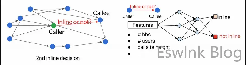 在 MLGO 之前,内联/非内联决定是由启发式做出的,随着时间的推移,它变得越来越难以改进。MLGO 用 ML 模型代替了启发式算法。在调用图遍历期间,编译器通过从图中输入相关特征(即输入)来向神经网络寻求是否内联特定调用者-被调用者对的建议,并按顺序执行决策,直到遍历整个调用图.