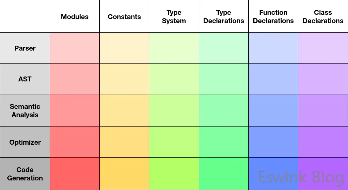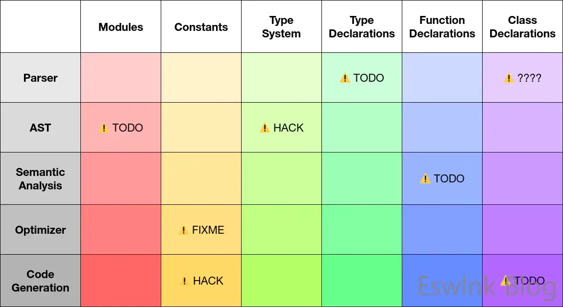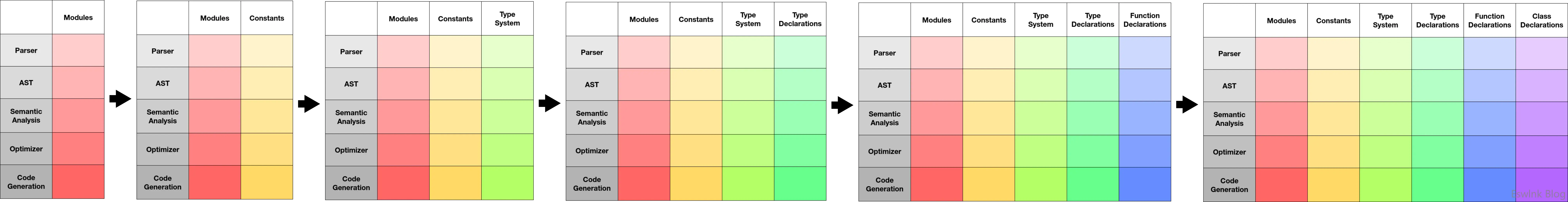 将编译器想象为 2D 网格。这些行是编译的阶段:从解析到中间端,再到后端。这些列是正在实现的编程语言的不同方面。对于像 C 这样较小的语言,不同的方面是:全局变量声明、枚举声明、类型声明、函数声明,仅此而已。更有特色的语言增加了额外的方面:C++ 中的接口和类定义, trait以及implRust 中的定义等。