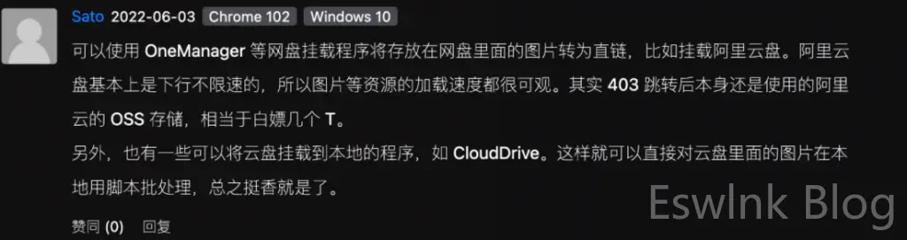 笔者还在这个写的很好的文章(参考:个人图床的最终抉择)看到这么一条评论,说也可以使用OneDrive来作为挂载盘。这就是笔者上一期文章(参考:利用OneManger+Onedrive+阿里云服务器(VPS)搭建5T大容量私有云,实现服务器磁盘扩容+可公有也可私有的个人网盘)提供的思路!