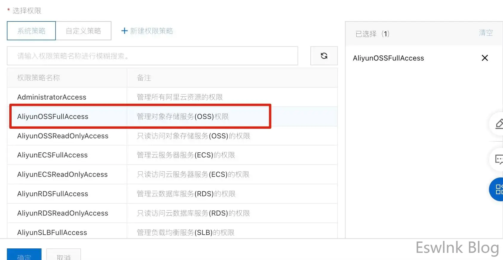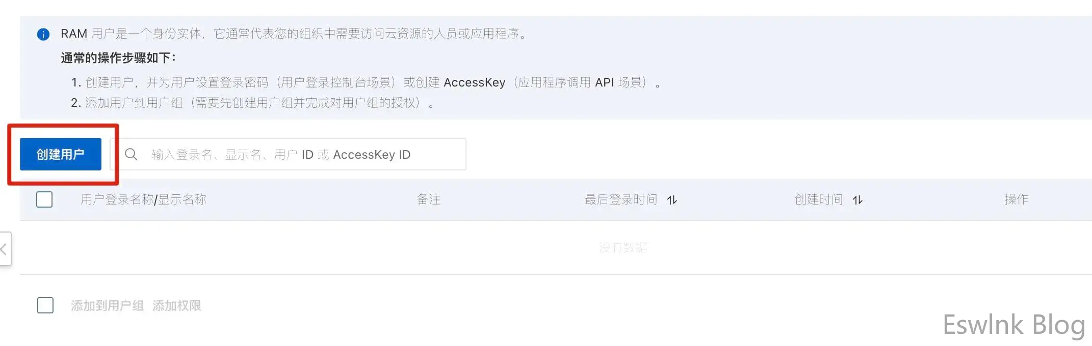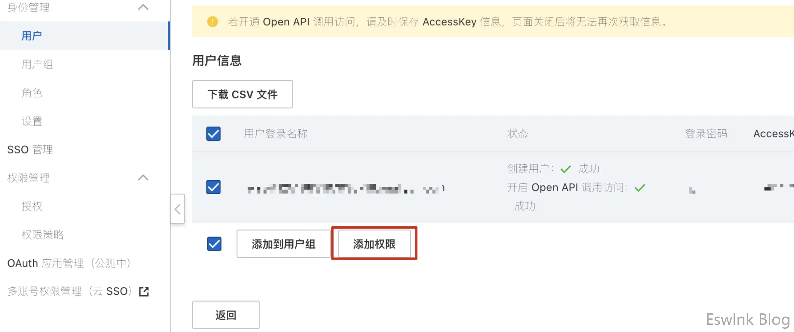 如果还没用户,就添加一个新用户。创建成功后,点击添加权限,选择OSS存储权限即可。