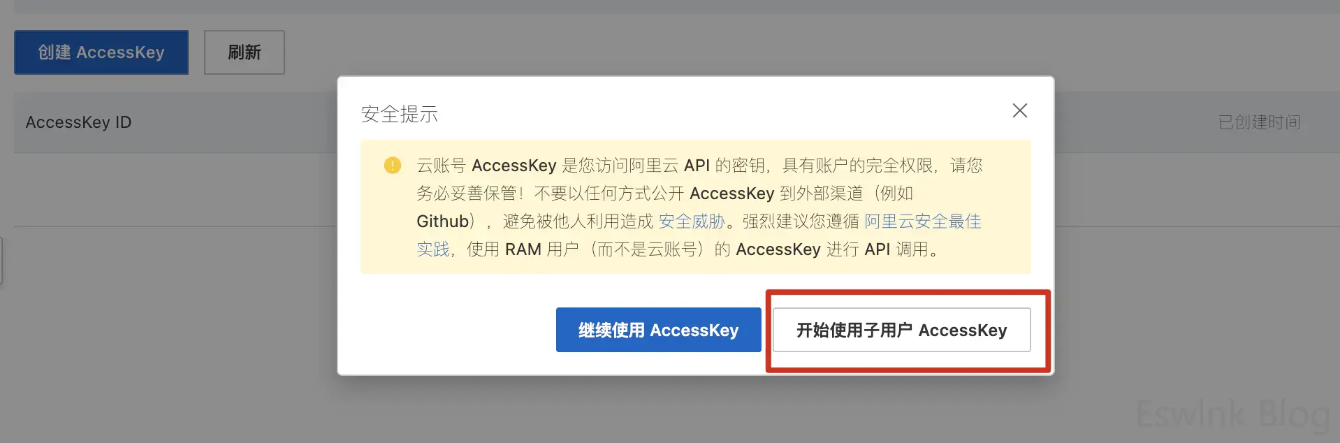 官方这里建议在当前账户创建一个 RAM 子账号,使用子账号的 AccessKey 更加安全,笔者这里就不使用子账号了(具体操作可以看阿里云的官方帮助:阿里云:如何获取AccessKey ID和AccessKey Secret,阿里云:创建RAM用户。)