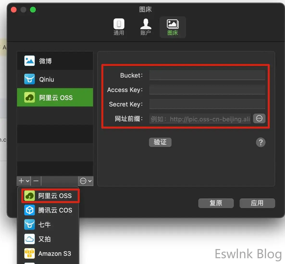 打开iPic的偏好设置(Window平台可以使用PicGo,配置是一样的),配置阿里云OSS存储的地址信息。Bucket填存储块的名字(前面你自定的,唯一的),然后分别填Key的信息。