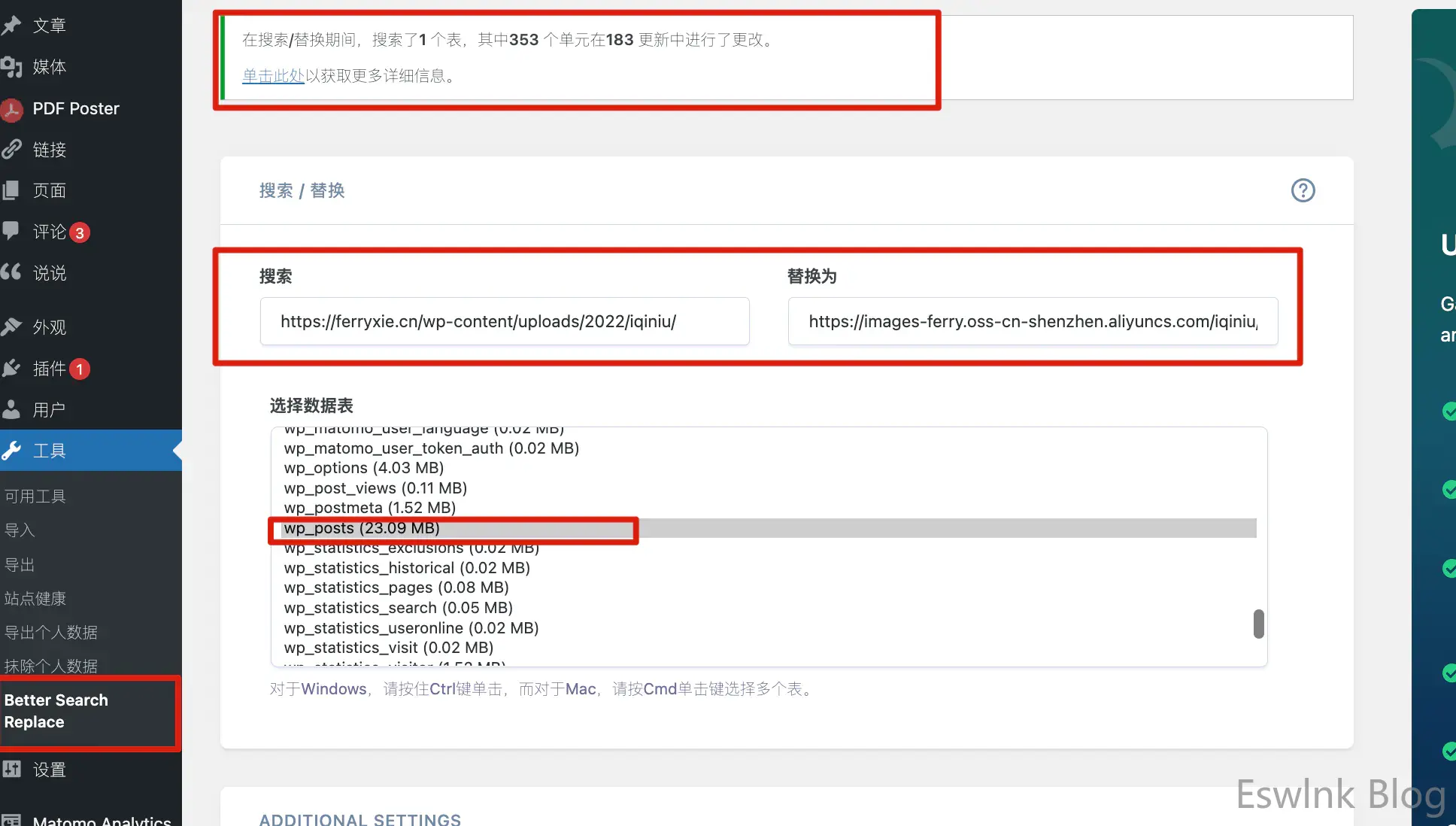 批量替换文章中的外链将原先文章中的外链头缀https://ferryxie.cn/wp-content/uploads/2022/iqiniu/替换为新的外链头缀https://images-ferry.oss-cn-shenzhen.aliyuncs.com/iqiniu/,使用到的WordPress插件是Better Search Replace