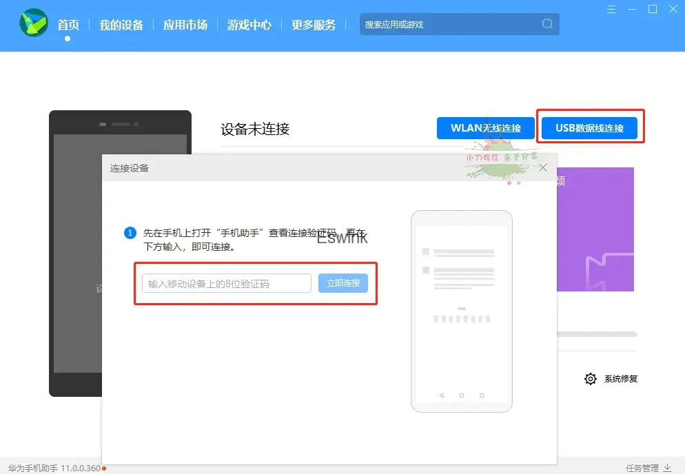 6.打开电脑上的华为手机助手,并通过USB线连接手机,弹出是否允许USB调试点击确定,然后会自动跳转到华为手机助手,点击始终允许授权,然后输入验证码连接到电脑。