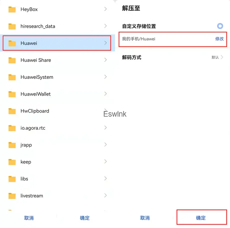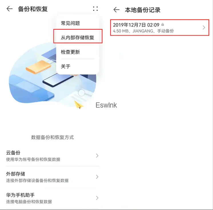 1.打开(2.备份)把里面的backup.rar复制到手机上,然后解压到 我的手机/Huawei 这个位置。