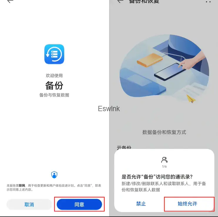 3.返回打开备份和恢复,点击同意-始终允许-我知道了,完成后返回,再点击进来就可以了。