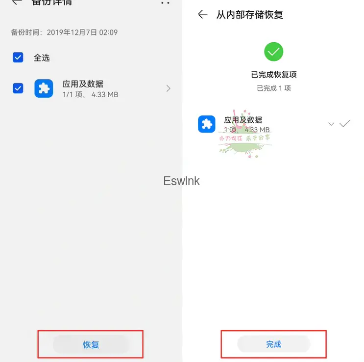 4.点击右上角-从内部存储恢复,选择备份,选中恢复,查看提示输入密码,密码为a12345678,恢复后点击完成。
