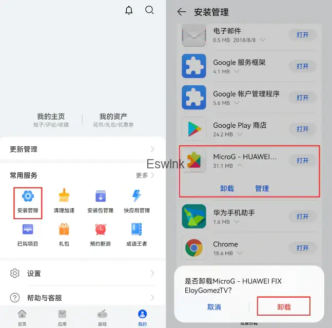 6.安装完成后打开手机应用市场-我的-安装管理,找到谷歌登录器进行卸载。