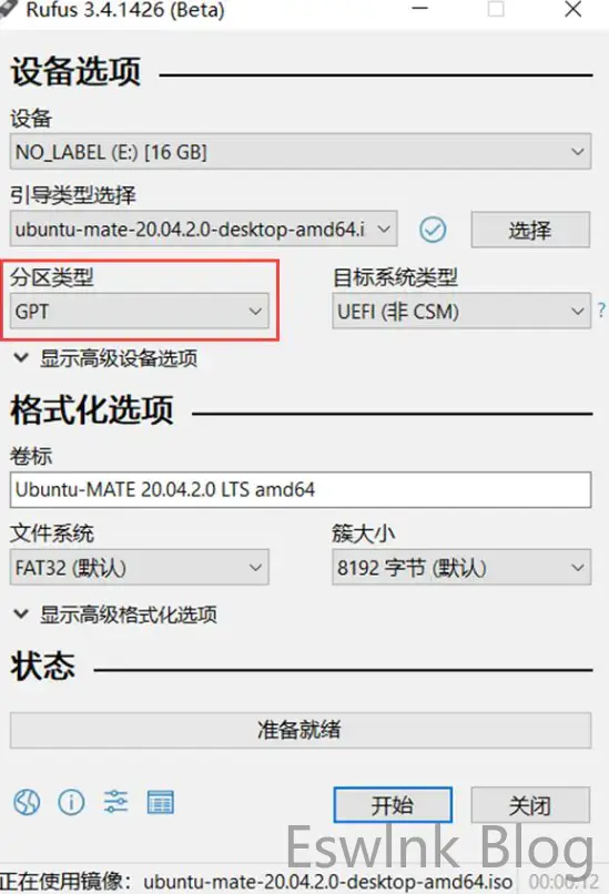 3、将16 GB U盘插入电脑,打开「Rufus」,镜像档选择「Ubuntu」,选择「GPT」,其他选项保持默认,点击制作。