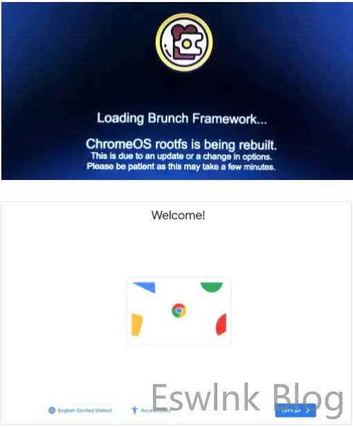 启动电脑后,会出现 Brunch的启动页面,等上一段时间,可以看到完整的 Chrome操作系统启动页面和注册激活页面。