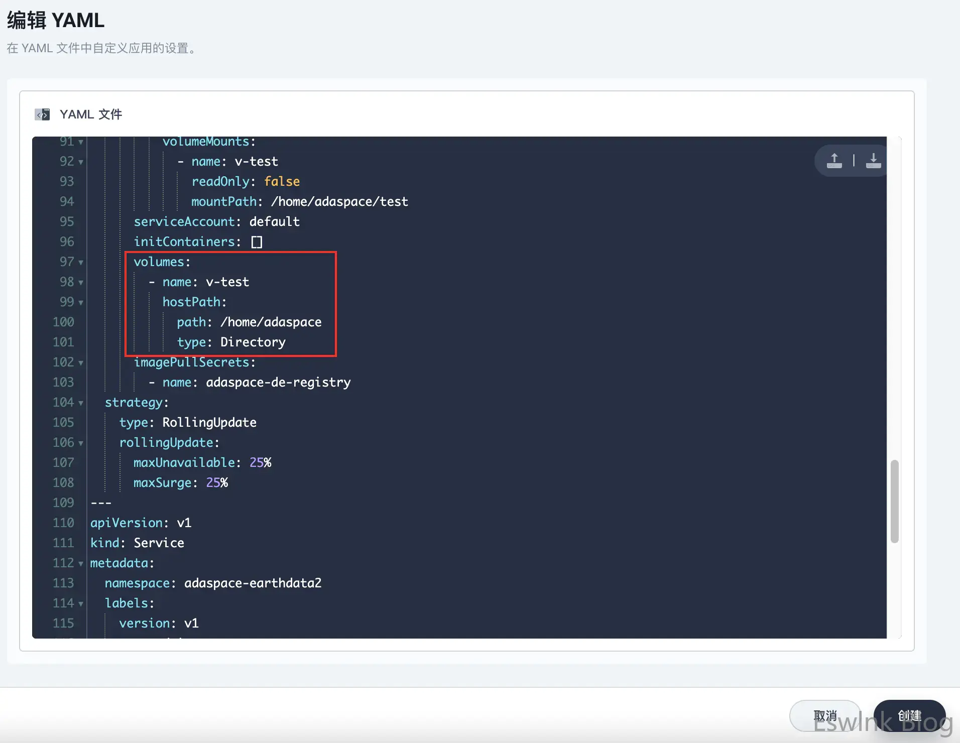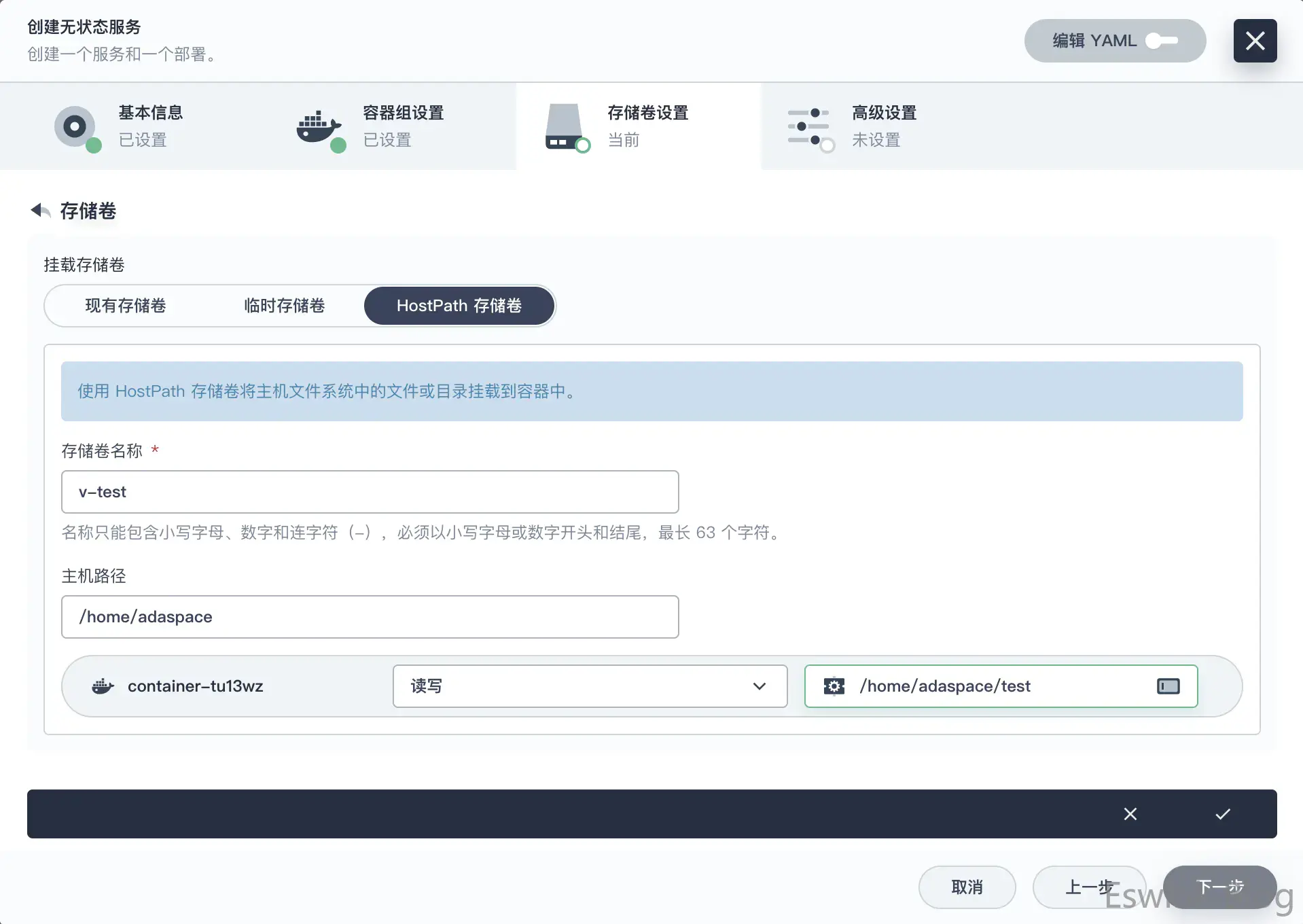 kubeSphere磁盘挂载设置界面,此处使用了kubesphere 自带磁盘挂载设置(采用hostPath),配置完成查看yaml 并未生效,运行容器时也报出未找到对应存储卷的错误。