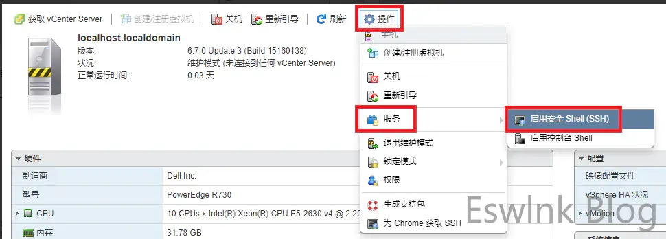 2、登录 ESXi 控制台,选择「操作」>「进入维护模式」。