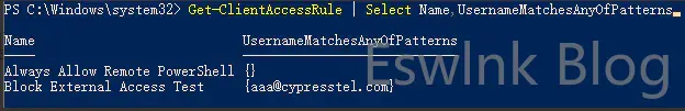 Get-ClientAccessRule | Select Name,UsernameMatchesAnyOfPatterns