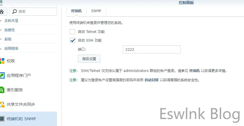 - 进入「控制台>程式>终端机与 SNMP」,开启 SSH的能力,设定 SSH埠。