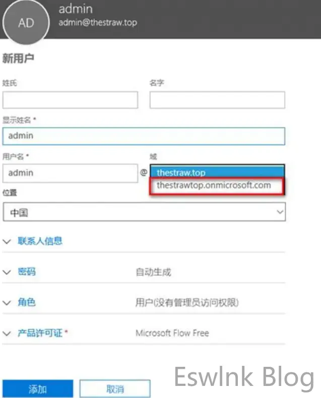 - 请为本页添加一个新的全局管理员用户,并使用默认域名(非定制域名)作为后缀。