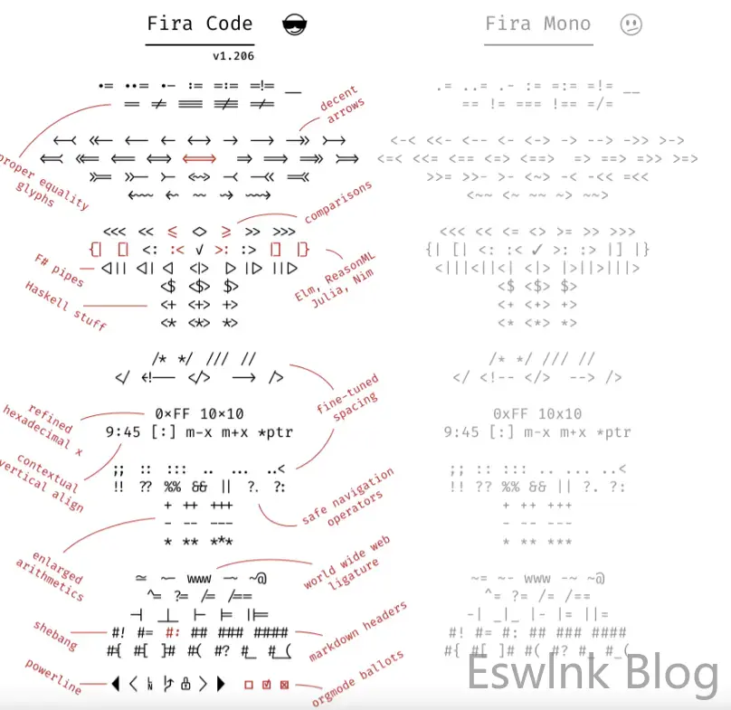 从下图中我们就可以知道,Fira code的编程连字等宽到底是什么意思: