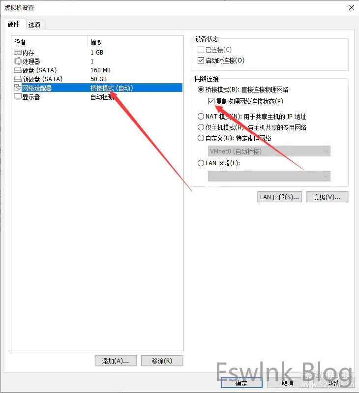 3.网络适配器 侨联模式 勾选复制物理网络连接状态