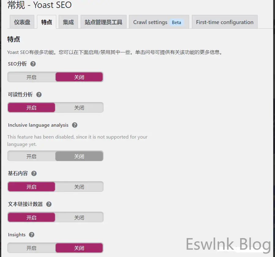 在常规设置的特点页面中,建议关闭 SEO分析 与 Insights 功能。如下图: