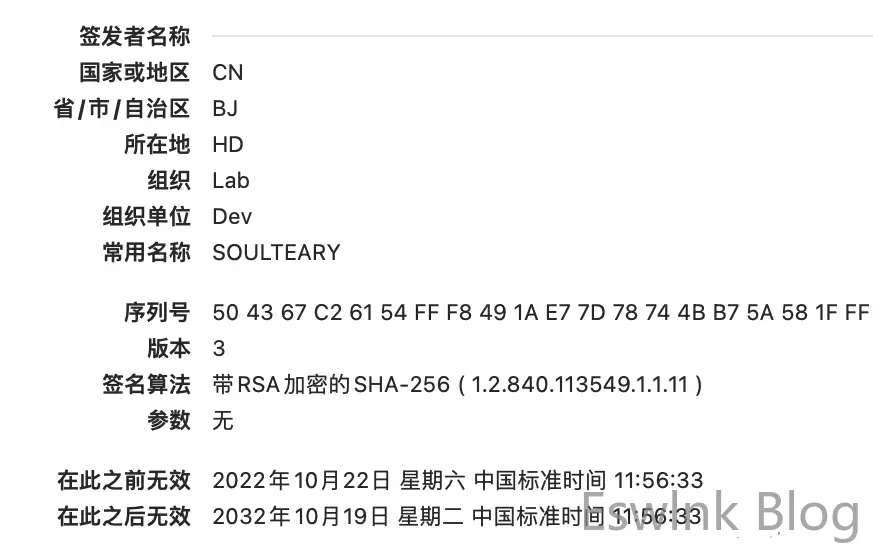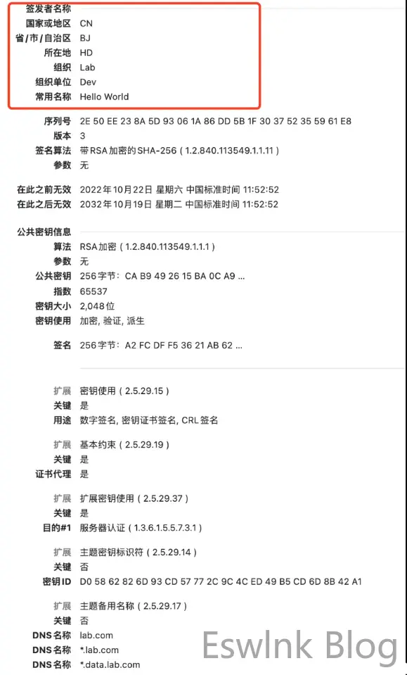docker run --rm -it -v `pwd`/ssl:/ssl soulteary/certs-maker "--CERT_DNS=lab.com,*.lab.com,*.data.lab.com" "--CERT_CN=SOULTEARY"再次查看生成证书信息,就能够看到信息已经发生了变化。